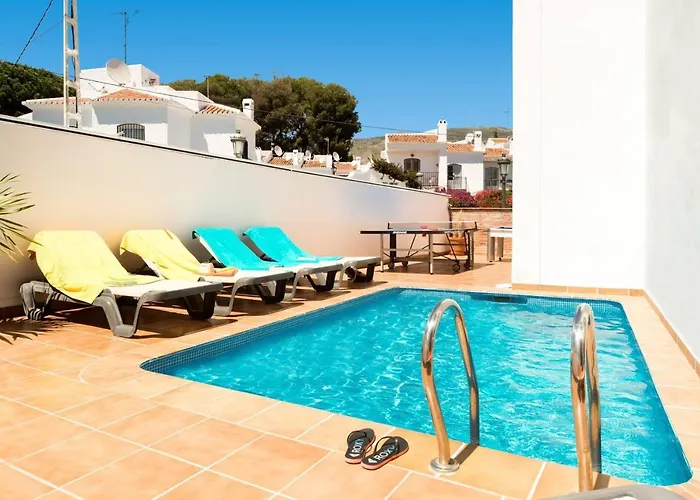 Den familjeinriktade Nerja Paradise Rentals - Villa Buganvilla, som ligger 5 minuter till fots från Playa de Burriana, har en terrass med utsikt över bergen. Villan med 3 sovrum och 3 badrum, som ligger 750 meter från Playa Calahonda, erbjuder soldäck, solterrass och utomhuspool för gästernas underhållning.